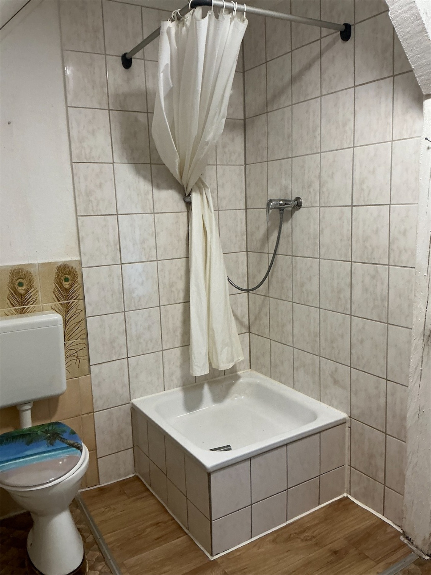 Die Wohnung verfügt über zwei Zimmer, darunter ein Schlafzimmer, ein Wohnzimmer und ein Badezimmer. Das Badezimmer ist mit einer Dusche ausgestattet und bietet alles, was man für die tägliche Körperpflege benötigt. Die Räumlichkeiten sind hell und freundlich gestaltet, was eine angenehme Atmosphäre schafft. Hohe Decken und historische Details verleihen der Wohnung einen besonderen Charme.